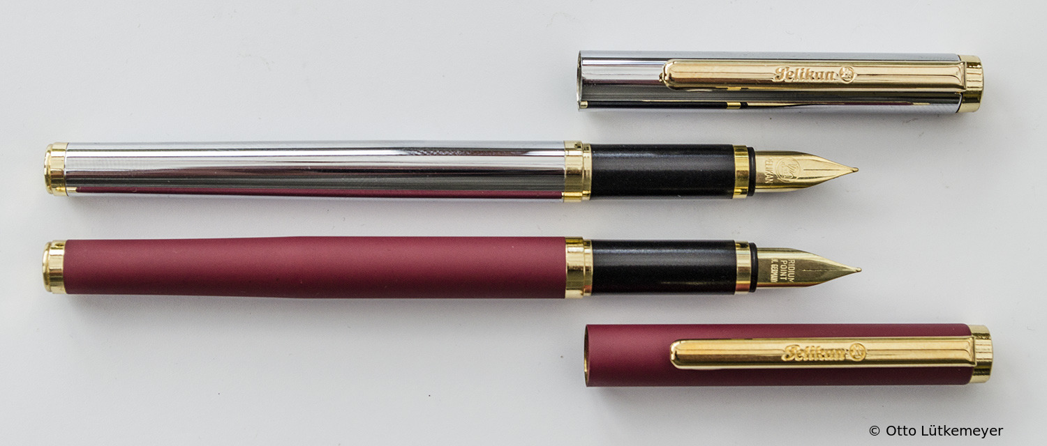 The pens have nibs with different engravings. One is '© Pelikan' and carries the Pelikan Logo, the second nib is engraved 'IRIDIUM POINT W-GERMANY'.