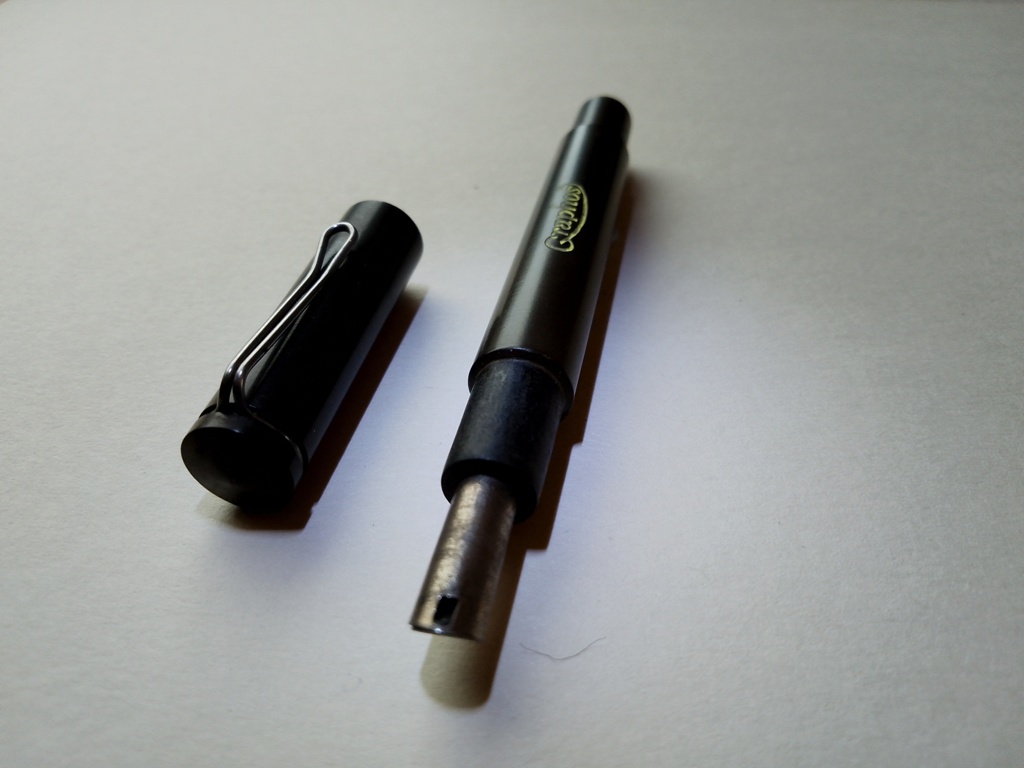 As a distinction to the usual Graphos holders this specimen has a metallic portion (about 7 mm wide), which then merges into the barrel from plastic. This metal part is not just a decorative ring, but massively. While the barrel serves as the ink reservoir at the Graphos previously known, the ink reservoir ends with this pen in the metal part. A round metal mandrel then establishes the further connection to the end of the solid plastic. The depth of the ink tank thus is reduced from 69 mm to 21 mm, the ink absorption of 1.6 ml to 0.5 ml.